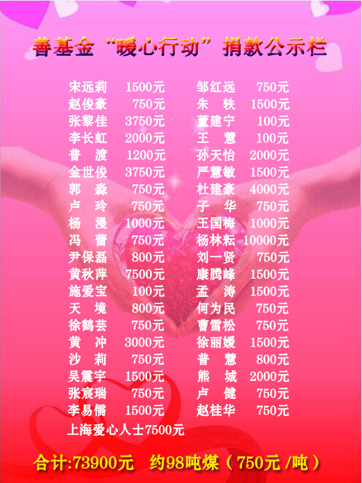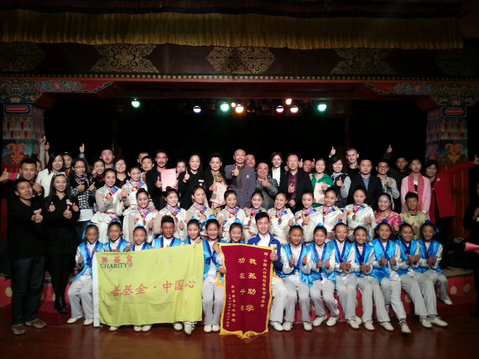 2014年10月26日,善基金中国心•爱心团第二十一届“把爱传出去”爱心活动由中国人口福利基金会善基金发起人金树萍女士携手爱心企业家金达融资担保有限责任公司董事长杜建豪、善基金爱心明星大使著名藏族歌手德格叶、善基金顾问道隆法师、北京盛德康科贸有限公司董事长熊城、秋园农夫商贸(北京)有限公司总经理徐丽援、北京新经纬交通建设有限公司总经理何为民、中国传统文化促进会文化教育执行主任张镤、善基公益项目总监康腾峰、社会爱心人士曹雪松、普慧、乔翠萍及就读北京世青国际学校的年龄最小的爱心人士兼志愿者孙天怡等一行三十余人,承载着来自各界爱心人士满满的爱心来到了位于昌平区藏文化园内的盛基艺术学校,看望这些来自地震灾区的藏族孤儿们,并送去98吨取暖用煤及御寒衣服、红糖等生活物资,由于学校急缺过冬用煤约200吨,爱心企业家杜建豪现场决定补齐剩余102吨,让孩子们过一个“暖心”的冬天!