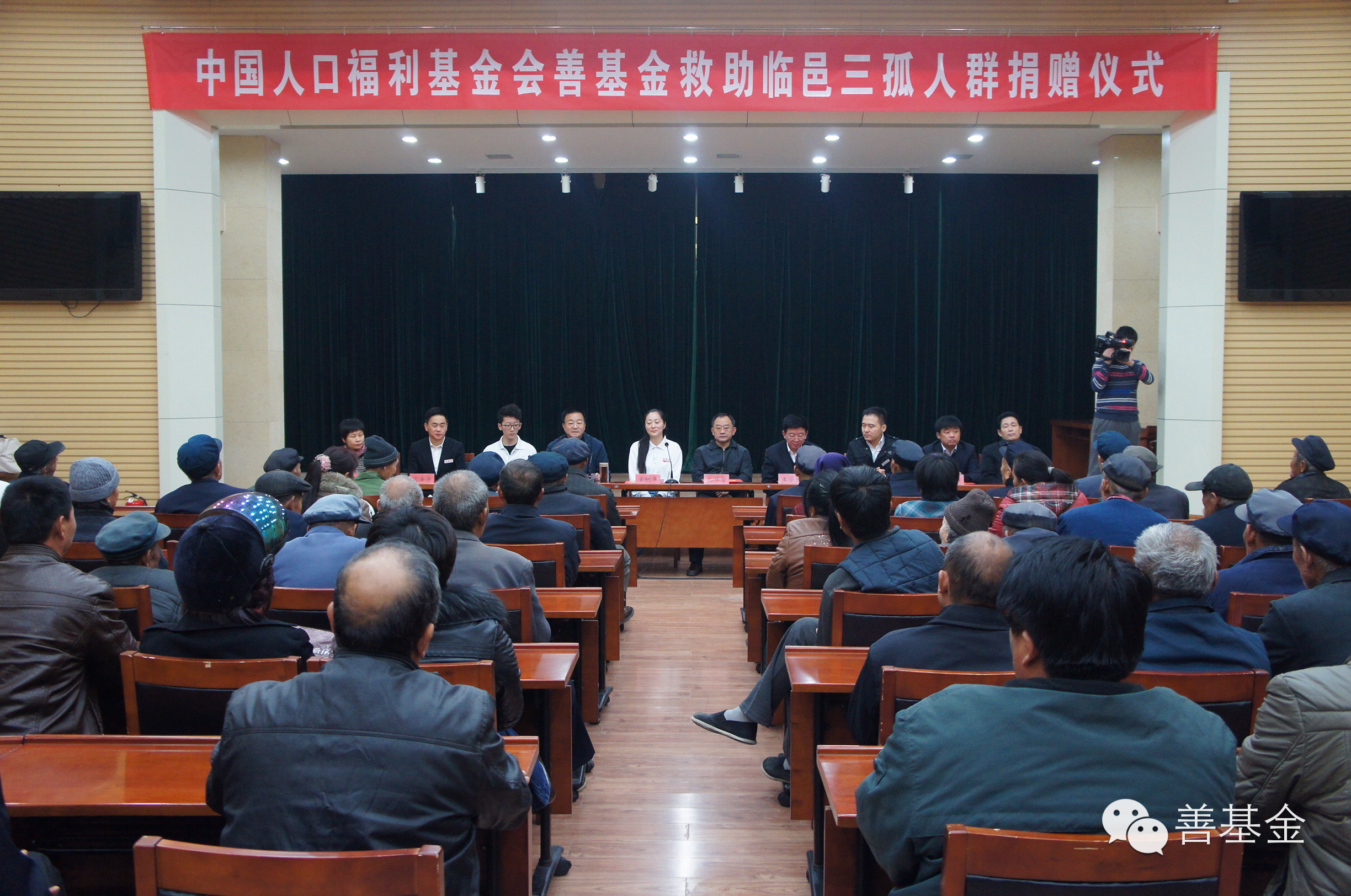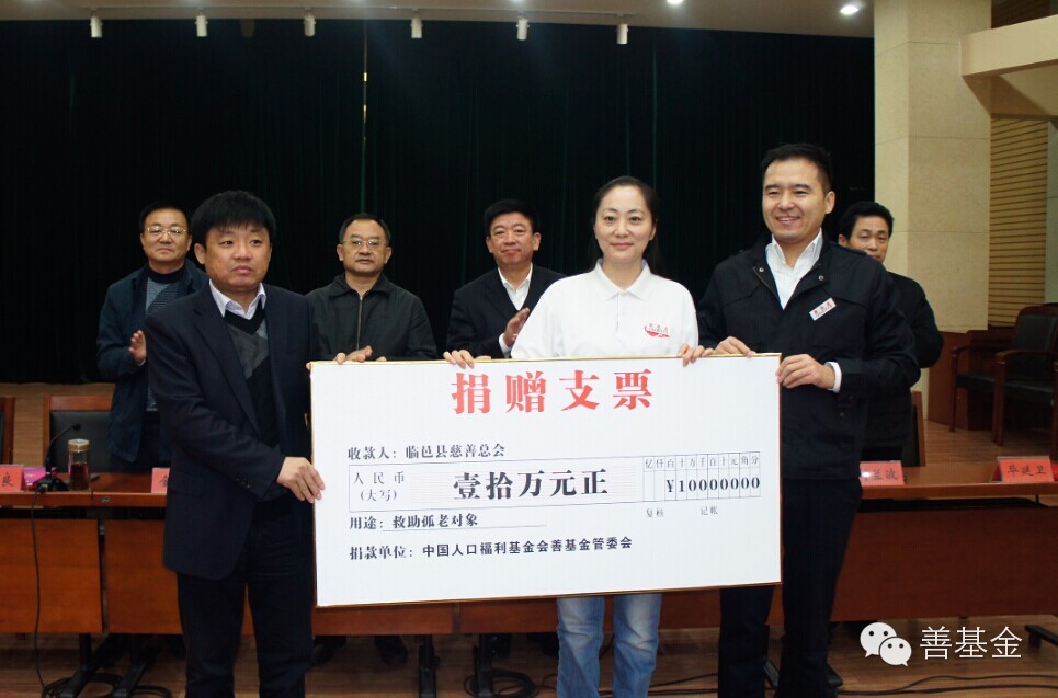 2014年11月10日,中国人口福利基金会善基金向山东临邑县三孤人群捐赠善款10万元,捐赠仪式在临邑县会议中心举行,中国人口福利基金会善基金发起人、执行主任、中国人民解放军总后勤部金盾影视中心副主任金树萍,德州市政协副秘书长孔祥智,临邑县政协主席邓荣良,县政府党组成员王学祥,县民政局局长刘兰波,县民政局副局长王鹏,县计生局局长陈晓静,县政协秘书长毕延卫,中国房地产业协会金融委副秘书长、善基金爱心合作伙伴乔琦,爱心企业家沈海华,北京耀中国际学校的外国籍学生志愿团,受助的80多名三孤人员代表参加捐赠救助仪式。